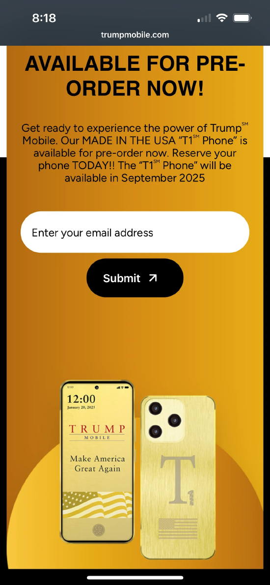 该网站底部写道:“特朗普移动及其产品和服务并非由特朗普集团或其任何关联公司或负责人设计、开发、制造、分销或销售。”