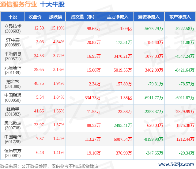 个股表现方面,通信服务行业当日领涨股为立昂技术(300603),该股当日报收12.59,上涨15.19%,成交量98.65万,主力资金净流入1.09亿元。ST中嘉(000889)以上涨4.84%紧随其后,该股当日成交量20.82万,主力资金净流出173.31万元。除此之外,平治信息(300571)、元道通信(301139)、挖金客(301380)均进入当日牛股之列。具体个股列表见下表:
